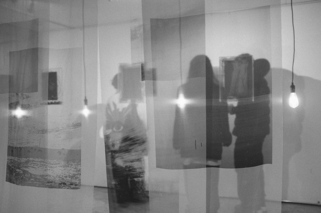 展示には写真を見るだけではなく、より写真とコミュニケーションとれる、自分から発見できるようにしたく、メインの写真を2枚づつセットして、布やトレーシングペーパーなどにプリントし、裏の写真を透けて少し見えるようにしました。